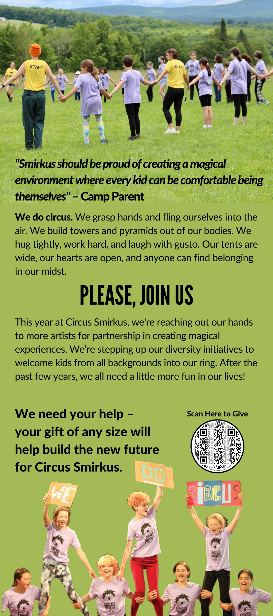In 2022, youth circus organization Circus Smirkus faced an aggressive goal to meet fundraising need. I created the concept, facilitated the mailing, segmented the audiences and achieved results, meet fundraising goals. I managed all of the development operations for the entire 2022 year, grossing over half a million in fundraised income.